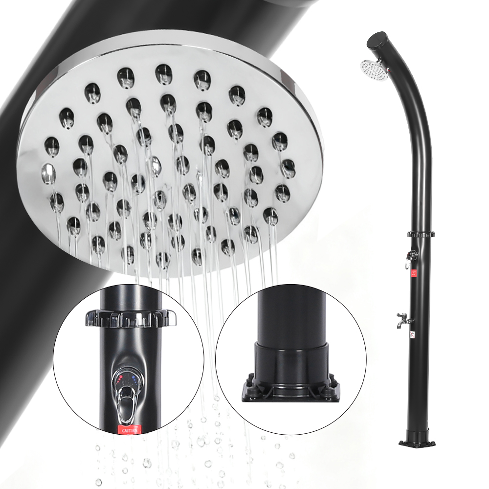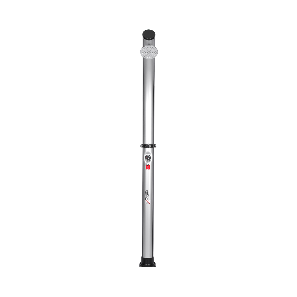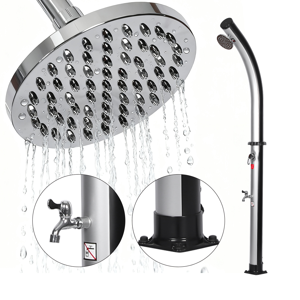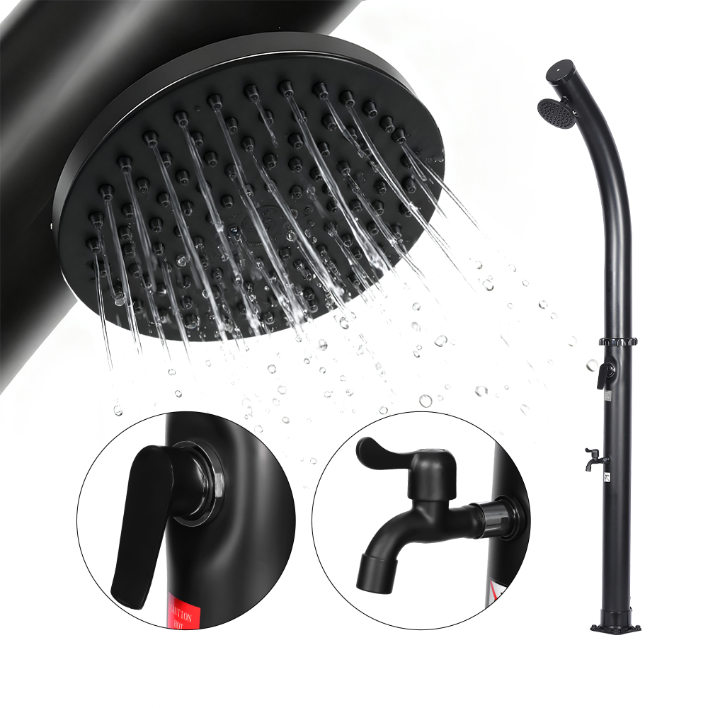 Depois de encher o tubo do chuveiro com uma mangueira de jardim, a água aquece naturalmente ao sol e o encaixe integrado permite um fácil ajuste à temperatura preferida. Projetado para versatilidade, este chuveiro solar para piscina externa de corpo curvo LY18L02 18L autônomo com chuveiro é perfeito para passeios à beira-mar, relaxamento à beira da piscina ou escapadelas no campo, tornando-o uma excelente escolha para hotéis, casas de férias e bangalôs para fornecer conforto refrescante em qualquer lugar. Também é equipado com uma conveniente conexão de mangueira para enchimento sem esforço e um bujão de drenagem para esvaziamento rápido, garantindo uma preparação fácil e segura para armazenamento no inverno.