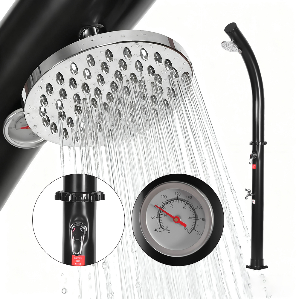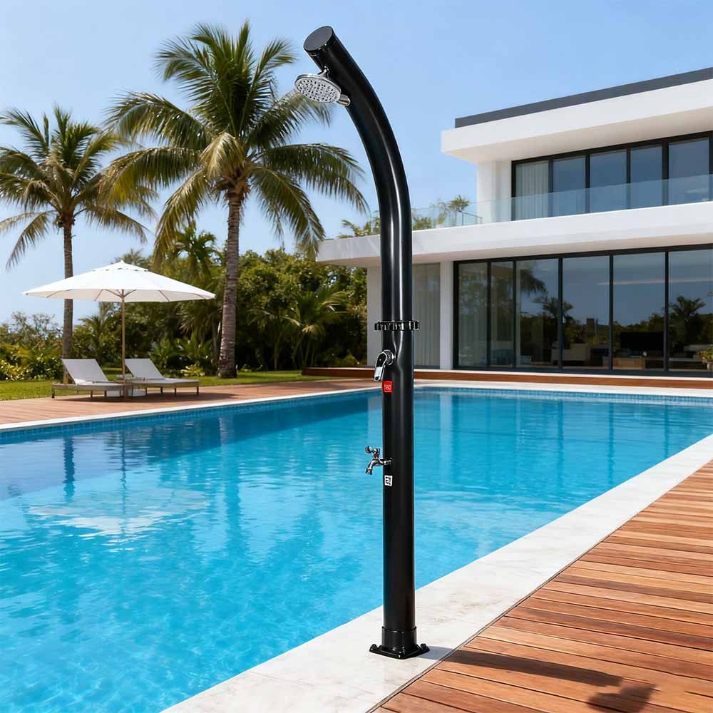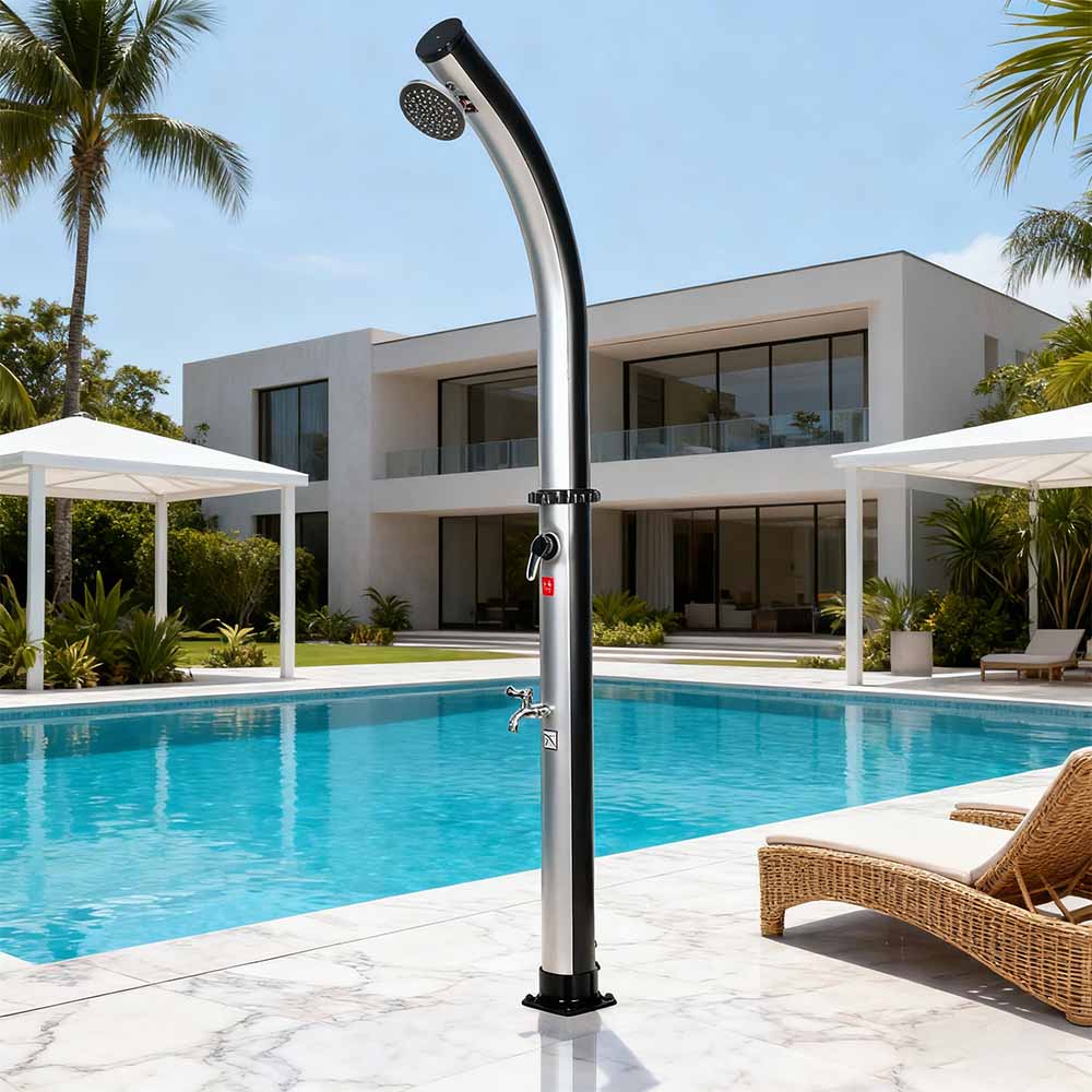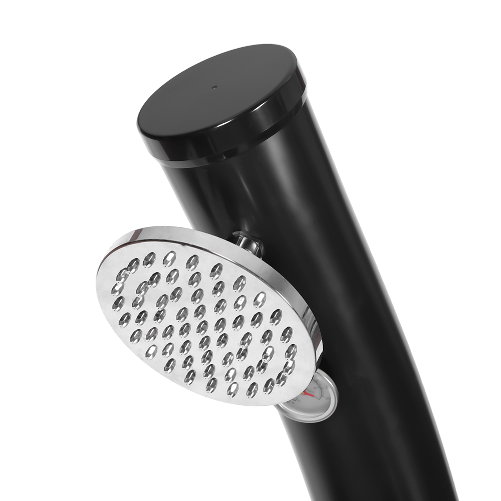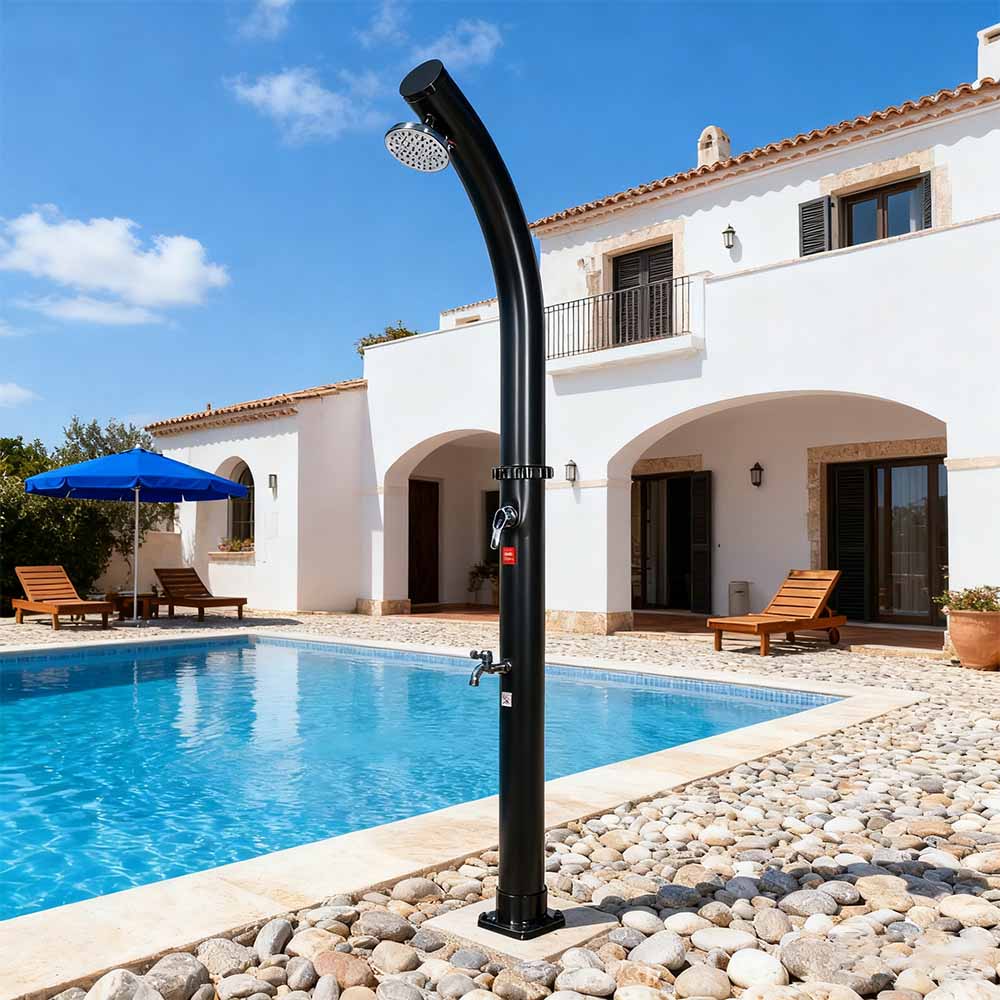 Depois de encher o tubo do chuveiro com uma mangueira de jardim, a água aquece naturalmente ao sol e o encaixe integrado permite um fácil ajuste à temperatura preferida. Projetado para versatilidade, este chuveiro solar para piscina externa de corpo curvo LY18L02 18L autônomo com chuveiro é perfeito para passeios à beira-mar, relaxamento à beira da piscina ou escapadelas no campo, tornando-o uma excelente escolha para hotéis, casas de férias e bangalôs para fornecer conforto refrescante em qualquer lugar. Também é equipado com uma conveniente conexão de mangueira para enchimento sem esforço e um bujão de drenagem para esvaziamento rápido, garantindo uma preparação fácil e segura para armazenamento no inverno.
