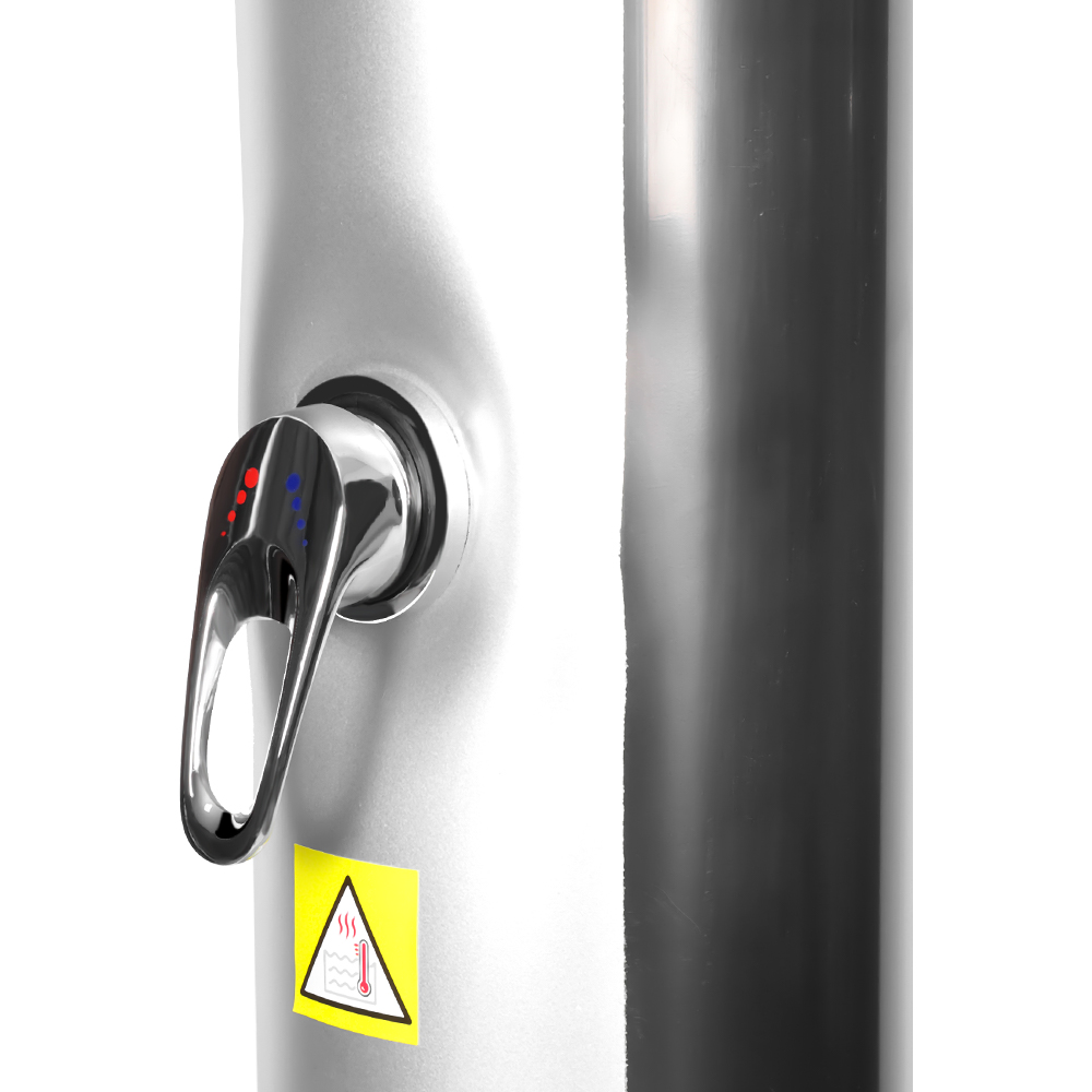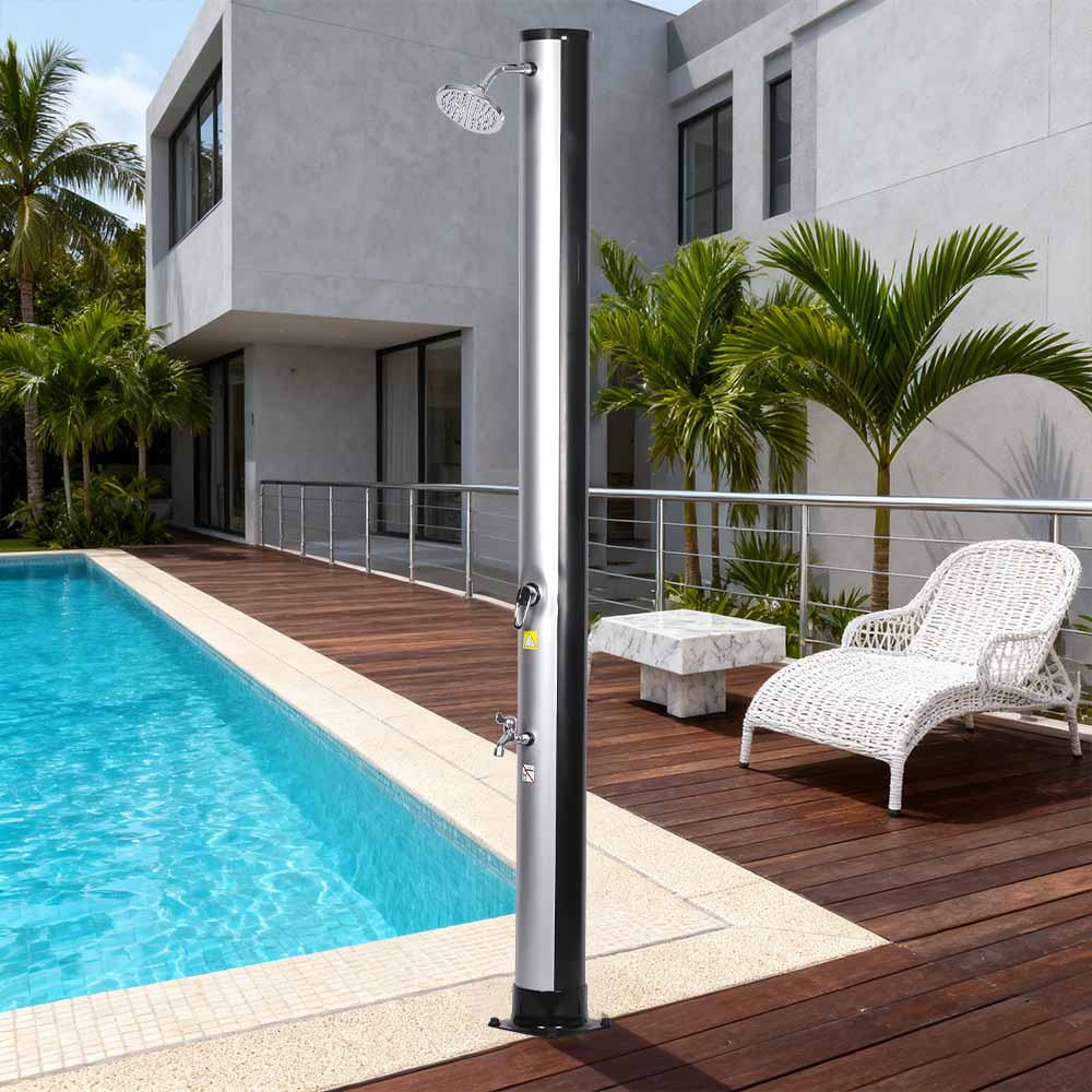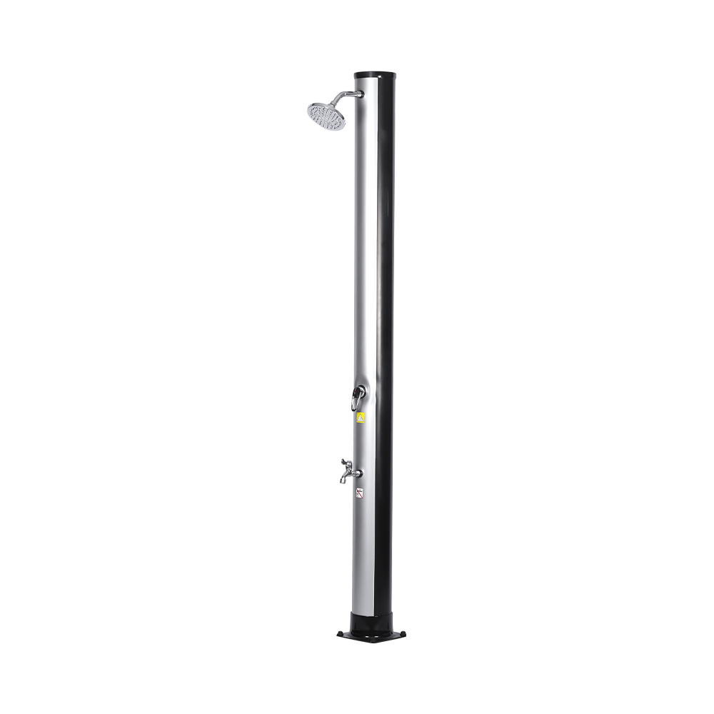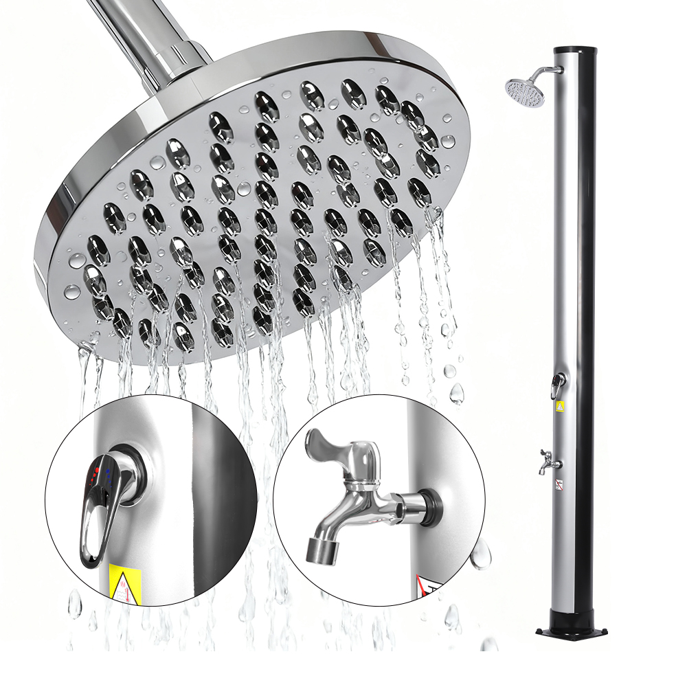 O tubo de chuveiro de tamanho generoso deste chuveiro solar ecológico portátil para exterior LY35L06 aproveita a energia do sol para aquecer a água até 60 ° C, não necessitando de eletricidade e oferecendo uma solução ecológica para banhos ao ar livre. Basta conectar uma mangueira de jardim padrão para encher o tubo do chuveiro e toda a família poderá desfrutar de um banho revitalizante no jardim, na piscina ou em um acampamento. Uma prática bandeja de metal embutida mantém os itens essenciais do banho, como sabonete e xampu, ao seu alcance, enquanto as ranhuras de drenagem na parte inferior evitam que a água se acumule, garantindo uma experiência limpa e agradável. O chuveiro de chuva giratório 360°, montado em uma junta esférica integrada, permite ajustar a direção do fluxo de água com facilidade, criando uma agradável sensação de resfriamento, enquanto a torneira adicional para enxaguar os pés oferece uma maneira conveniente de se refrescar rapidamente. Projetado para maior comodidade, este chuveiro pode ser facilmente desmontado para armazenamento compacto e com economia de espaço durante o período de entressafra ou para transporte em viagens.